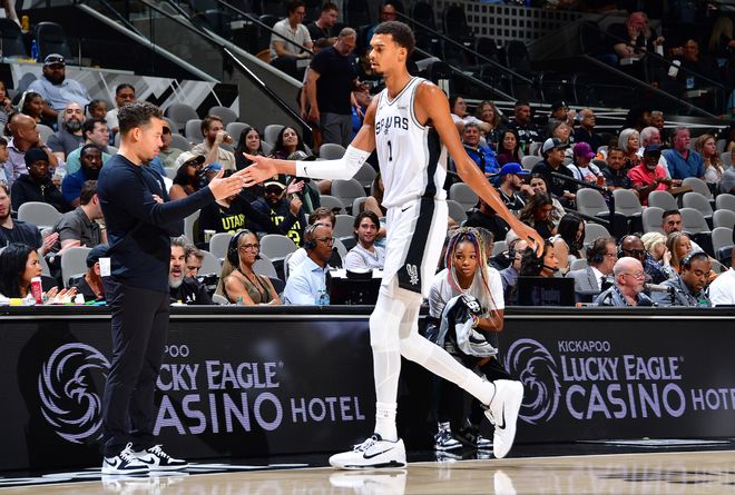 第一节马刺34-30领先4分,文班亚马开场迎着努尔基奇命中打板三分,之后突破上篮得分,首节最后40多秒,马刺新科榜眼哈珀与文班亚马完成不可思议的连线——文班刚过半场就示意哈珀空接,最终文班完成炸裂的暴扣2+1,马刺主场沸腾,但老乐福沦为背景板。